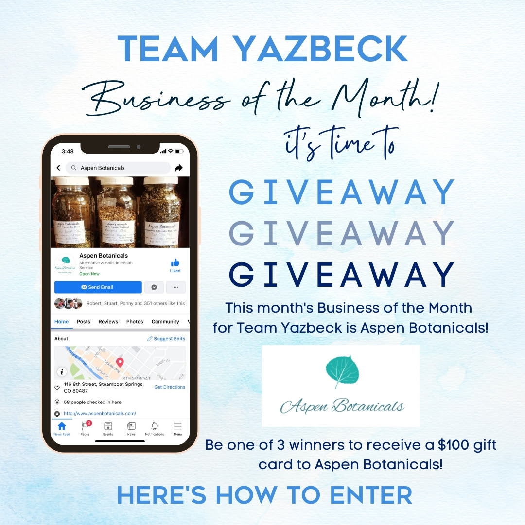 Aspen Botanicals is Team Yazbeck’s October Business of the Month! We’ll be giving away 3 $100 gift cards to Aspen Botanicals at the end of this month!